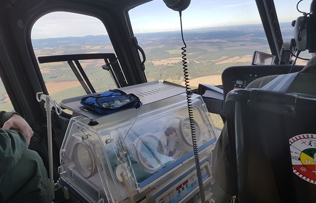 Já no domingo (02), novamente as equipes foram mobilizadas, dessa vez para realizar o transporte aeromédico de um recém-nascido portador de pneumonia, infecção do trato urinário, pielonefrite e cardiopatia congênita, do município de São Joaquim para Blumenau. Por terra, levaria aproximadamente cinco horas, e com o emprego da aeronave aconteceu em 55 minutos.