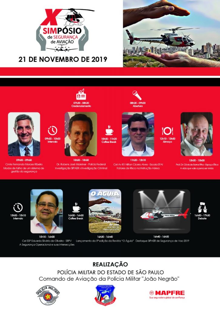 São Paulo – O Comando de Aviação da Polícia Militar do Estado de São Paulo (CAv/PMESP) realizará, no dia 21 de novembro do corrente ano, o X Simpósio de Segurança de Aviação, com o objetivo de atualizar as tripulações envolvidas nas operações de Segurança Pública e Defesa Civil com as melhores práticas de Segurança de Voo, promover a cultura de Segurança de Voo como parte da campanha educativa estabelecida pelo CAvPM, elevar a consciência situacional dos aeronavegantes do CAvPM e demais instituições participantes e viabilizar o intercâmbio e integração entre o público interno do CAvPM e membros de outras Forças de Segurança Pública/Defesa Civil, Forças Armadas e Aviação Civil.