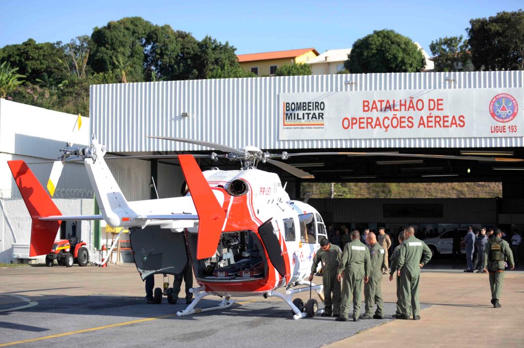 O secretário de Estado de Saúde de Minas Gerais, José Geraldo de Oliveira Prado, e o chefe do Estado-Maior e subcomandante do Corpo de Bombeiros Militar de Minas Gerais, coronel Ezequiel Silva, participaram, nesta quinta-feira (29/05), no Batalhão de Operações Aéreas (Aeroporto da Pampulha), da cerimônia de entrega do primeiro helicóptero biturbina dos seis que serão adquiridos pelo Governo de Minas para o atendimento aeromédico no Estado. O equipamento é o primeiro do país deste modelo e com esta configuração, preparado para atendimento aeromédico, segundo a Helibrás.