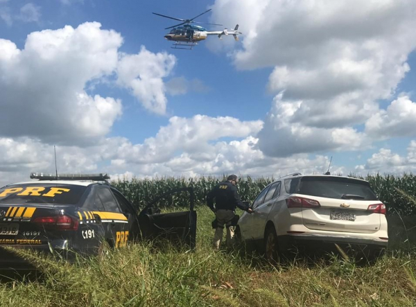 O motorista desobedeceu à ordem de parada, na BR-467. Seguido por viaturas e por um helicóptero da PRF, o homem abandonou o carro de luxo e se refugiou, a pé, em meio a uma plantação de milho. Buscas foram feitas, mas o contrabandista ainda não foi localizado.