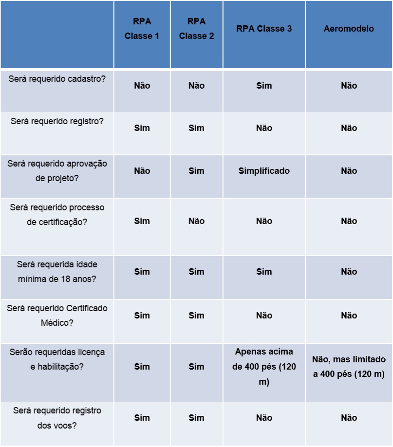 Para a Classe 3: peso menor ou igual a 25 kg – todos os pilotos deverão ser maiores de 18 anos, não será requerido Certificado Médico Aeronáutico (CMA), serão requeridas licença e habilitação apenas para quem pretender operar acima de 400 pés (120 m), e não será necessário elaborar o registro dos voos.