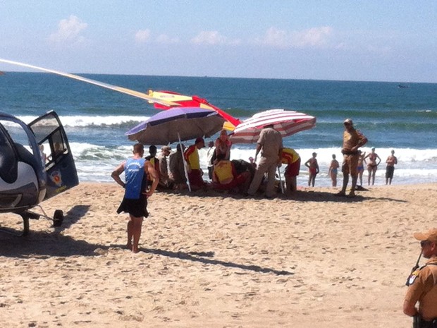 Na faixa de areia, a equipe médica iniciou protocolo para atendimento de afogamento grau 6 (com parada cardiorrespiratória). Foram realizadas ventilações de resgate, simultaneamente à compressões torácicas, sem retorno da respiração espontânea.