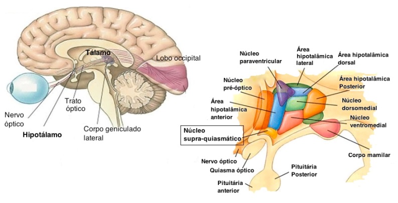 Os ritmos biológicos mais conhecidos são os circadianos – em torno de um dia ou 24 horas (Mena-Barreto, 2004). A organização temporal dos seres vivos, especialmente do homem, possibilita sua adaptação a fatores recorrentes ambientais (Cippola-Neto, Menna-Barreto, Marques, Afeche & Silva, 1996). No ser humano reconhece-se que o componente circadiano do ciclo vigília-sono é gerado por um relógio biológico que funciona no núcleo supraquiasmático (NSQ) do hipotálamo (Fig. 1) (Mello, Minati & Santana, 2008), localizado na base do cérebro, acima do cruzamento dos nervos óticos, o quiasma ótico.