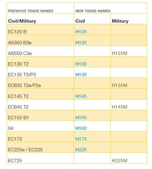 A nova identificação dos produtos da empresa leva a letra “H” e segue a mesma numeração utilizada pelo fabricante de jatos comerciais Airbus. Os helicópteros com a denominação EC ou AS tornam-se H e sua numeração passará a definir a categoria da aeronave por peso, em ordem crescente. As versões militares serão acrescidas da letra “M”.