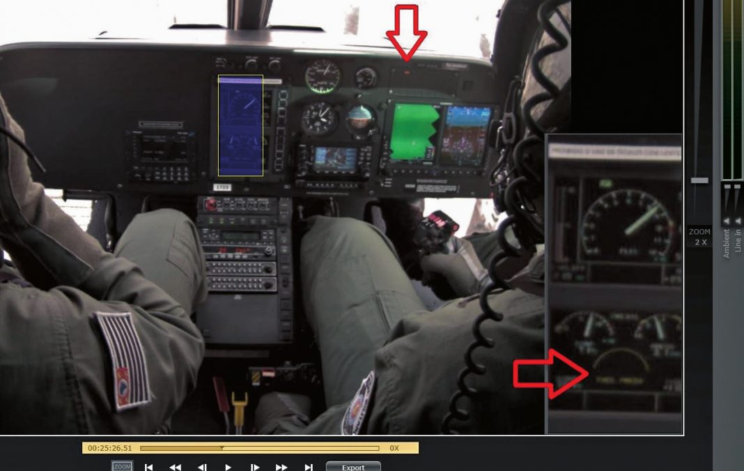 O sistema é o mais simples de seu fabricante, possuindo gravação da imagem, som ambiente, coordenada geográfica dos locais sobrevoados, e dados de pitch e roll (inclinação lateral e longitudinal) da aeronave; sistemas de última geração do mesmo fabricante oferecem mais recursos, todavia esse equipamento ao filmar os instrumentos do painel fornece valiosas informações como por exemplo a altitude do voo.