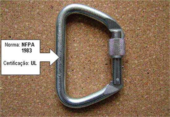 4.1. Nas atividades de salvamento: segundo a norma NFPA 1983, a carga de uma pessoa é de 300 lbs (135kg) e a carga de resgate equivale a 600 lbs (270 kg), estes valores levam em conta o peso estimado de uma pessoa padrão mais os equipamentos de segurança. Esta norma prevê mosquetões de uso geral em aço, com resistência nominal de 4.000 Kgf, como o da figura abaixo.