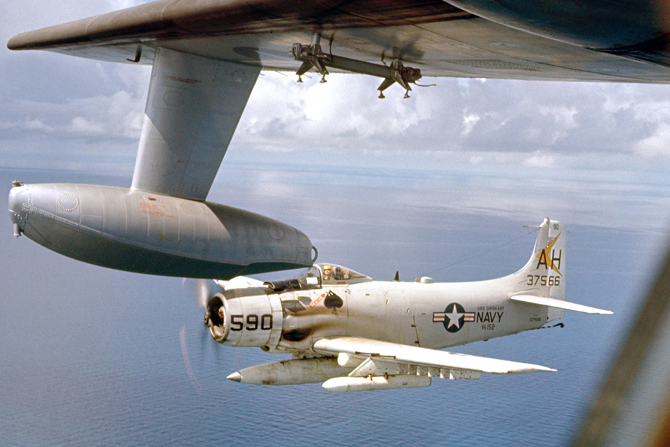 Uma aeronave Douglas A-1E escolta um avião anfíbio Albatross no Delta do Mekong, no Vietnã.