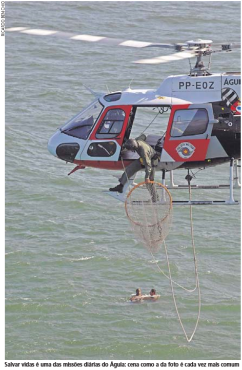 O dia 4 de abril de 2013 ficará marcado para sempre na memória do empresário Thiago Prando. Quando tentava manusear uma pistola finca-pino, ela explodiu na sua mão. “Meu tio e minha prima estavam na sala ao lado. Ao verem o meu estado, acionaram a Polícia Militar (PM),” recorda. O resgate veio pelo ar. Um helicóptero do Grupamento Aéreo (GRPAe) João Negrão, o Águia, pousou em um terreno baldio ao lado da empresa de Prando e, em menos de 15 minutos, ele chegou à sala de cirurgia do Hospital das Clí nicas (HC) de São Paulo. O primeiro-te nente PM Marcelo Henrique de Lima era copiloto dessa operação. “Salvar vidas é uma das missões diárias do Águia.” Cenas como essa são cada vez mais comuns no cotidiano do céu paulistano.