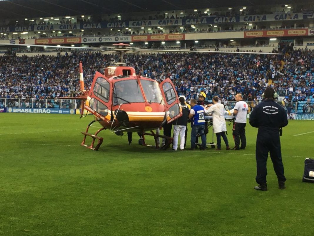 Foram ministrados alguns medicamentos e realizado a entubação endotraqueal. Após estabilização e imobilização do paciente, no momento do intervalo do jogo, foi realizado o segundo pouso do Arcanjo 01 para que efetuasse o transporte do paciente ao Hospital Governador Celso Ramos.