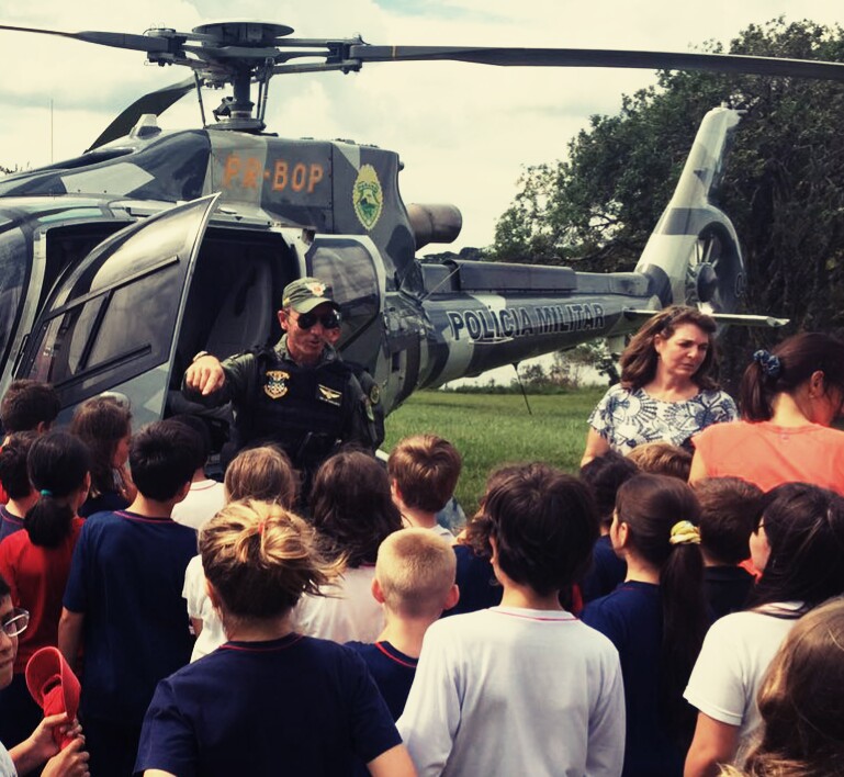 Tudo seguia conforme o planejado, até que os militares tiveram uma ótima surpresa quando, ao final das instruções, alunos do 4º ano do Colégio Suiço-Brasileiro que faziam uma visita ao Centro de Educação Ambiental Mananciais da Serra puderam ver de perto o Falcão da Polícia Militar do Paraná!