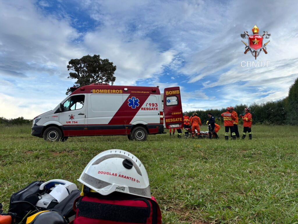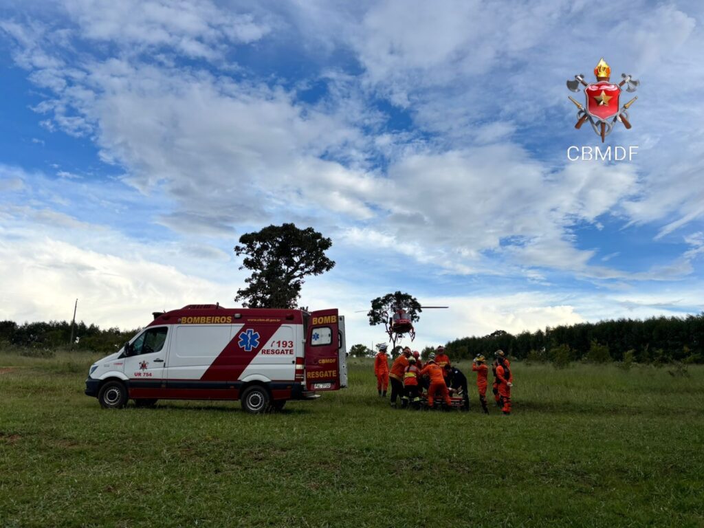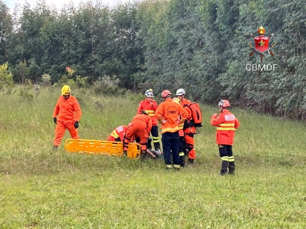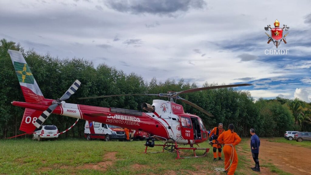 Distrito Federal — Um homem ferido durante trilha em área de difícil acesso foi resgatado pelo Corpo de Bombeiros Militar do Distrito Federal (CBMDF) com apoio de helicóptero na tarde de sábado (14/03), na região da Cachoeira Véu de Noiva, na Chapada Indaiá.