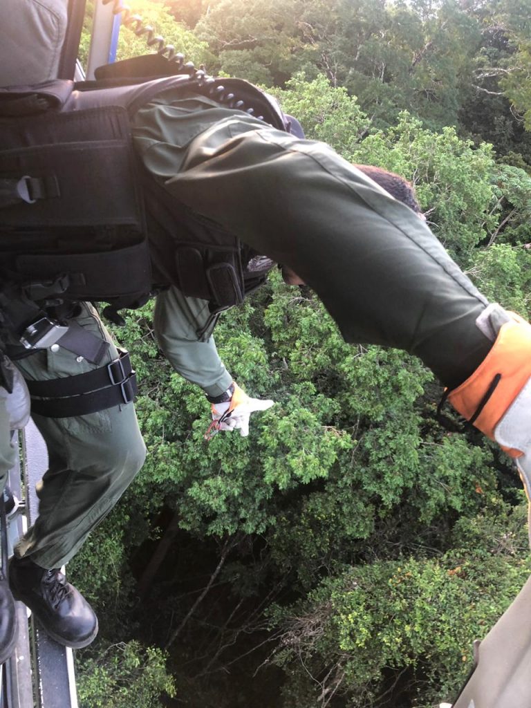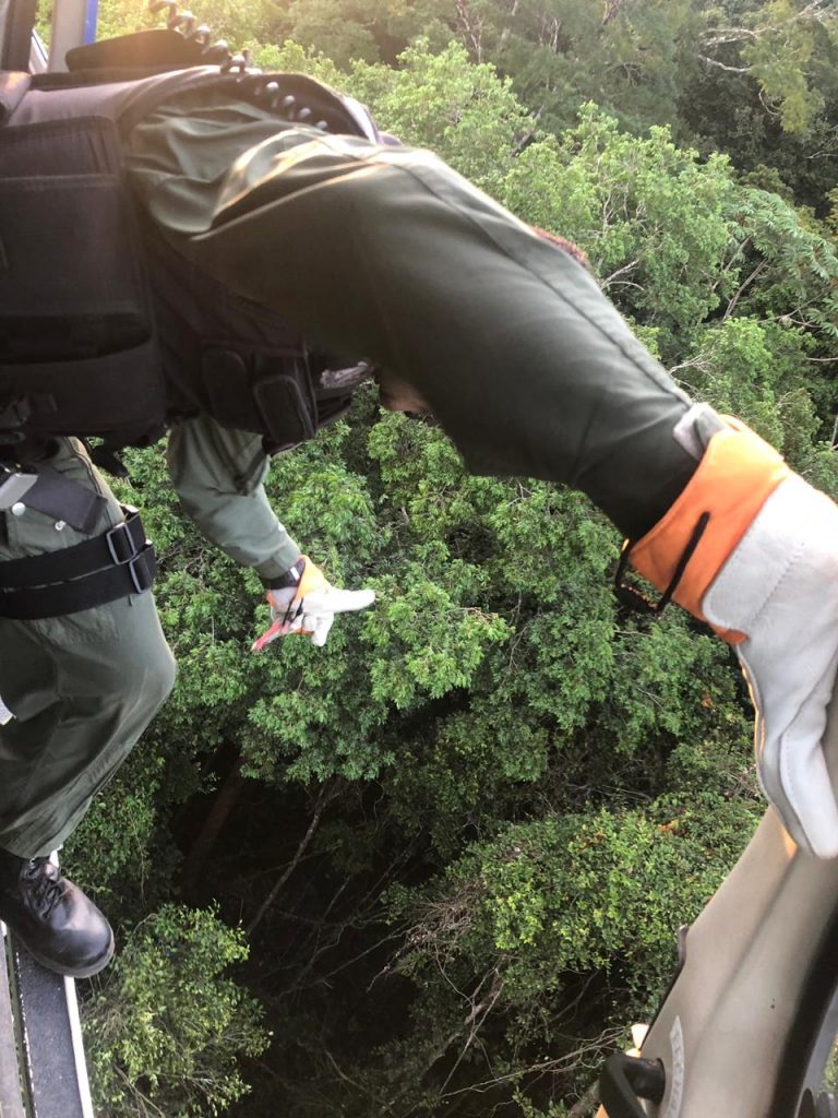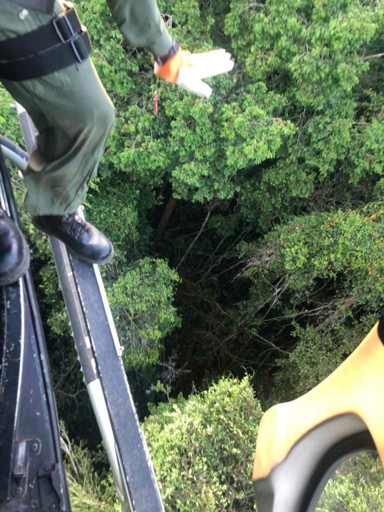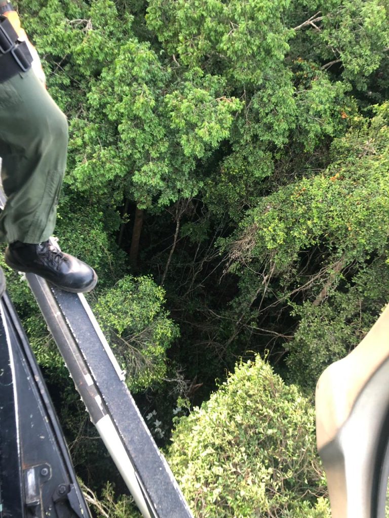 Instantes após, um dos tripulantes conseguiu contato visual com os policiais, porém o resgate com a aeronave seria inviável, haja vista a vegetação fechada.