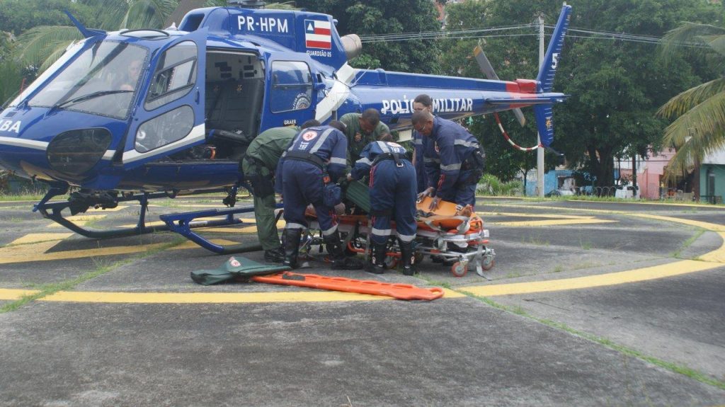Em trabalho em conjunto com o SAMU, a ambulância já aguardava a tripulação no heliponto do DPT (Departamento de Polícia Técnica), com a médica Patrícia e equipe para a realização do intermodal da vítima para o Hospital Aliança.