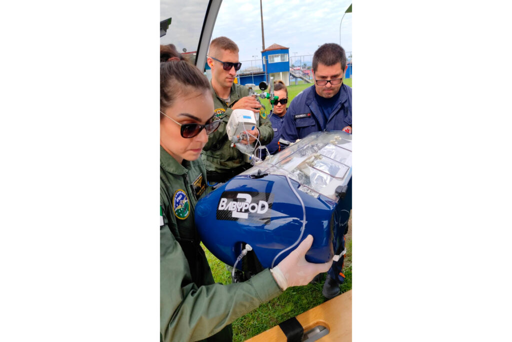INCUBADORA – Diferente de incubadoras convencionais, que podem pesar cerca de 110 kg, a BabyPod é fabricada em fibra de carbono, pesa aproximadamente 8 kg e possui certificação europeia. O equipamento foi projetado para proteger o recém-nascido contra vibrações, impactos e variações de temperatura durante o voo, proporcionando um ambiente estável e seguro mesmo em situações críticas.