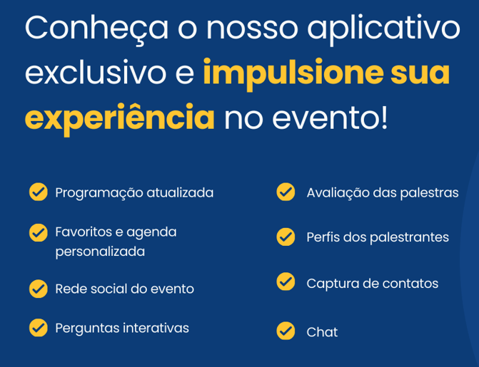 - Obter o comprovante de inscrição, com QR Code, direto no app — útil no credenciamento.