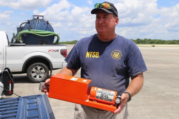 Dan Boggs segura o gravador de dados de voo recuperado de um Boeing 737-800 da Miami Air International que invadiu a pista da Naval Air Station Jacksonville (Foto: Domínio Público/NTSB)