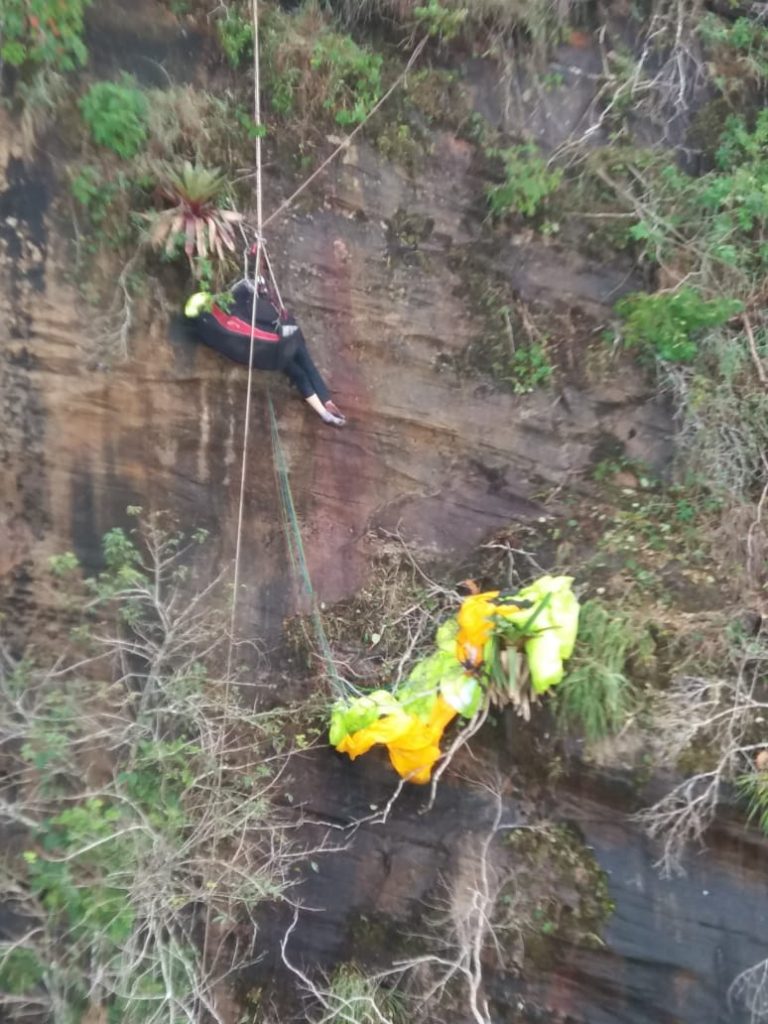 Uma equipe do Corpo de Bombeiros Militar de Minas Gerais realizou a descida de rapel durante a noite, chegando até a vítima, onde foi constatando o óbito da mesma.