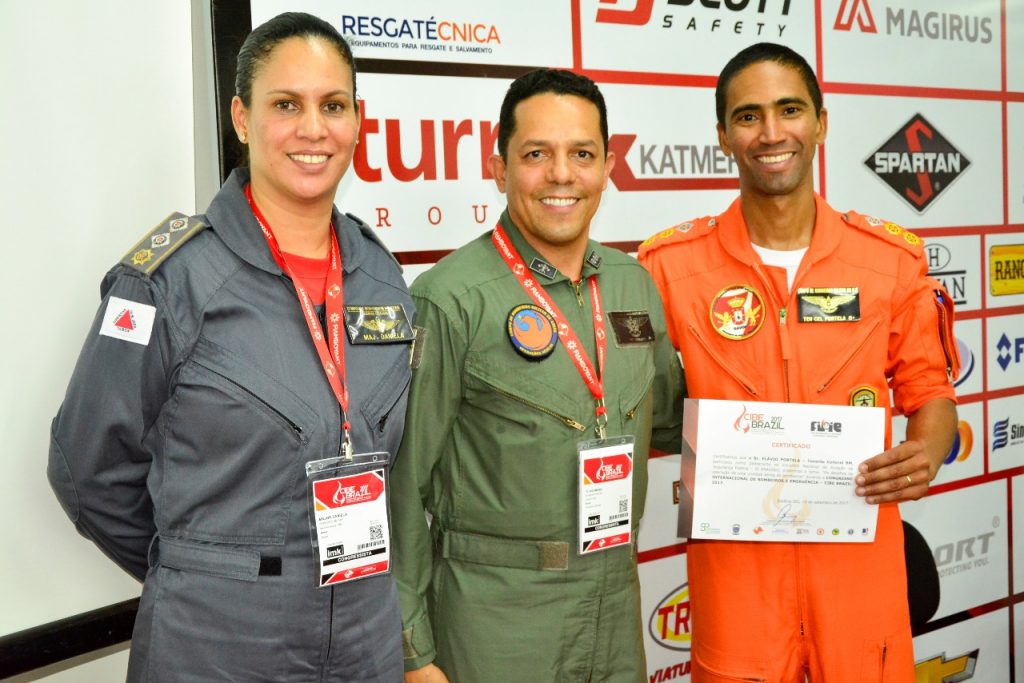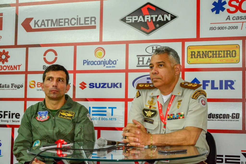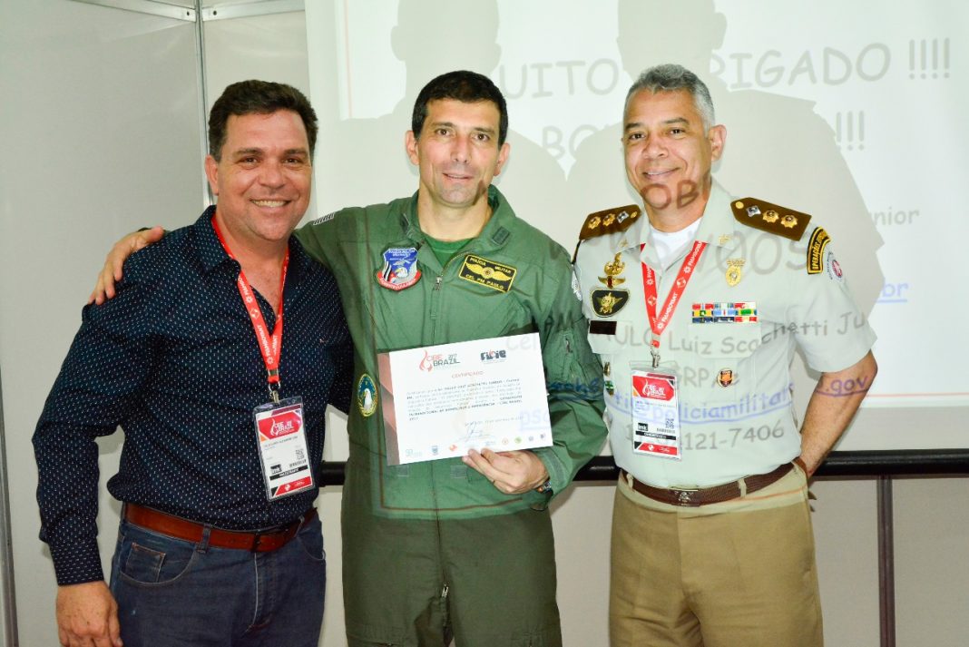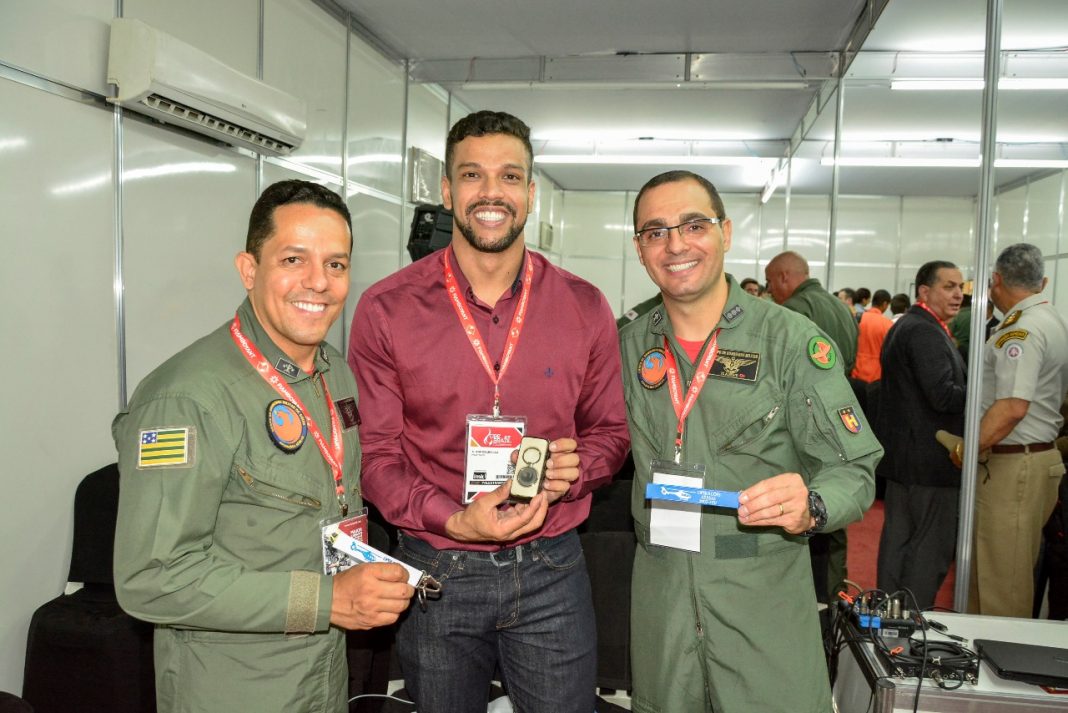 Comandante Thiago de Lima Luz da Receita Federal do Brasil ao centro, ao lado do Ten Cel BMGO Hofmann, comandante do COA/CBMGO e do Ten Cel BMGO Alberto, anfitriões do ENAVSEG 2017.